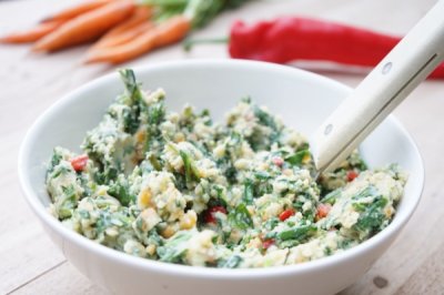 Zomerstamppotje vol groente, met speckjes en dille