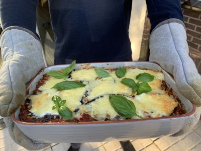Verwarm de oven voor op 175 graden. Was de aubergines en snijd ze in dunne plakken (in de lengte), doe 2 eetlepels olijfolie in een schaaltje apart en smeer de plakken hiermee in (handig om een kwastje te gebruiken). Bak de plakken aubergine 2 a 3 minuten op de grill. Schil en snijd de uien in dunne ringen. Verhit een koekenpan of hapjespan, doe hier de overige olijfolie in en bak de uienringen enkele minuten. Doe nu het gehakt, de knoflook en de Italiaanse kruiden erbij en bak het gehakt rul. Snijd de mozzarella fijn en vermeng in een schaal met de ricotta. Smeer een ovenschaal in met de olijolie die je over hebt en bedek met een eerste laagje aubergineplakken. Doe daarop een van het laagje mozarella-ricotta en vervolgens een laagje gehaktsaus. Herhaal dit tot je saus op is en maak hem af met een laatste laagje aubergineplakjes, mozzarella-ricotta en de belegenkaas. Zet de schotel 20 minuten in de oven. Garneer met de verse basilicum en dien op.