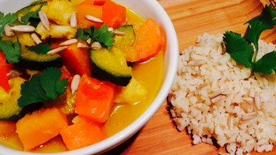 Snijd de pompoen in blokjes ter grootte van een dobbelsteen en de courgette in plakjes. Hak de gember fijn. Zet een wokpan met olijfolie of kokosolie op het vuur en laat de gember een minuutje fruiten met de specerijen. Voeg de pompoen en courgette toe aan de wok en bak het geheel 10 minuten op middelhoog vuur. Roer het mengsel regelmatig om. Breng ondertussen een pan met water aan de kook. Voeg de rijst toe en laat in circa 20 minuten zachtjes gaar en vrijwel droog koken. Snijd de kabeljauw in gelijke stukken en knijp de limoen er boven uit. Doe de kokosmelk bij de groenten in de wok en leg de kabeljauw tussen de groenten. Laat 20 minuten zachtjes stoven met een deksel op de pan. Serveer samen met de rijst en garneer met verse koriander.