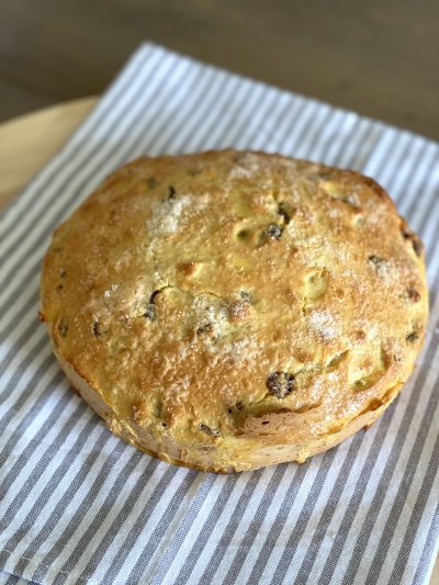 Laat de rozijnen 20 minuten wellen in een bakje water. Verwarm de oven voor op 180 graden en vet een bakvorm (18 cm doorsnede) in met olie. Zeef de volkoren meel en bakpoeder boven een kom. Kluts 2 eieren en meng met de kwark, 2 eetlepels zonnebloemolie, 50 gram suiker, vanillesuiker en een snuf zout. Voeg het mengsel en de uitgelekte rozijnen toe aan het meel. Roer met een lepel tot je een plakkerig deeg hebt. Verdeel over de bakvorm en bak 35 minuten in de oven. Halverwege de baktijd bestrijk je de kwarkbol met het losgeklopte mengsel van melk en eidooier. Optioneel bestrooien met suiker. Daarna in de oven afbakken tot de bovenkant goudbruin is.