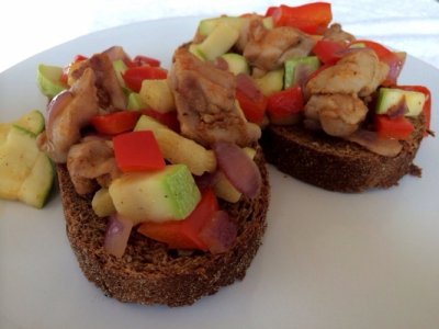 Rooster ondertussen de broodjes en beleg vervolgens de geroosterde broodjes met het kip-groenten mengsel.
