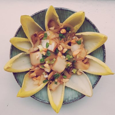 Maak de witlof schoon en snijd in reepjes. Snijd de sjalot en de 4 bosuitjes fijn en houdt +/- 1 gesneden bosui apart. Verhit de olie in een pan en fruit het sjalotje en 3 bosuitjes tot deze glazig zijn. Voeg vervolgens de reepjes witlof toe en bak mee. Wanneer de witlof begint te slinken kun je de sojasaus toevoegen. Hak ondertussen de pinda’s grof. Leg de gebakken witlof op een bord. Serveer met verse bosui en de grof gehakte pinda’s!