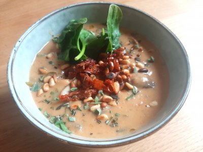 Witte bonensoep met paddestoelen en zongedroogde tomaten