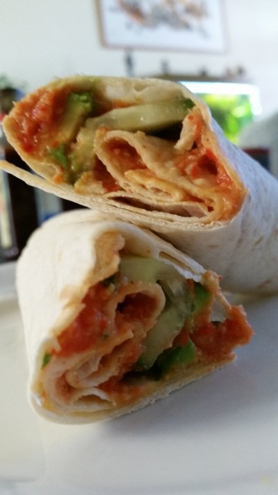 Besmeer de wraps voor 2/3 met ruim hummus. Leg in het midden de schijfjes komkommer en plakjes avocado. Vanaf de besmeerde kant oprollen en doorsnijden.