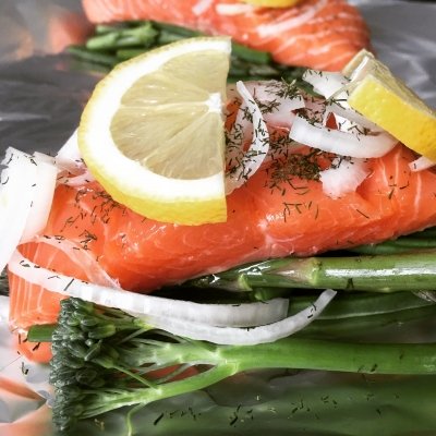 Was de groente en laat uitlekken. Schil de ui en snijd deze in dunne ringen. Was de citroen en snijd hier 2 dikke plannen vanaf die je vervolgens halveert. Leg 2 stukken aluminiumfolie klaar en leg hierop per vel 100 gram groente. Leg daar vervolgens een stuk zalm van ca 150 gram bovenop en bestrooi met zout. Dan de ui-ringen erop en een eetlepel olijfolie. Vervolgens per pakketje een halve eetlepel dille en afdekken met de citroen. Vouw de folie tot een dicht pakketje. Laat zo'n 20 minuten bakken op zo'n 200 graden C. in een voorverwarmde oven. Als de pakketjes klaar zijn, bestrooi met zwarte peper. Serveer met extra groene groente en eventueel (als je niet low-carb eet) gebakken aardappeltjes.