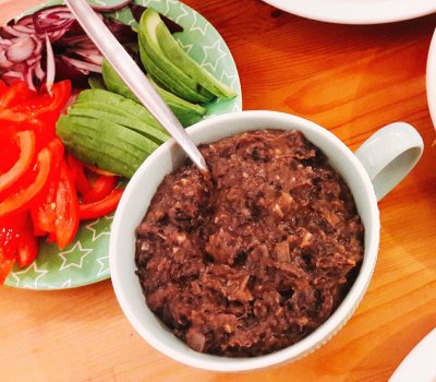 Pel de ui en knoflook en snijd fijn. Zet een steelpannetje op het vuur en verwarm daarin de olie. Voeg de ui en knoflook toe en fruit tot ze glazig zijn. Voeg dan de komijn, chillipoeder en het zout toe en bak nog even door op laag vuur. Doe de zwarte bonen (met vocht) bij het mengsel, voeg nog een klein scheutje water toe en laat 5 minuten doorkoken met de deksel op de pan. Zet het vuur laag en stamp de bonen met een stamppotstamper tot de gewenste structuur. De een houdt van super ‘’mushy’’ en de ander houdt van iets meer structuur. Breng op smaak met sumak of met limoen.